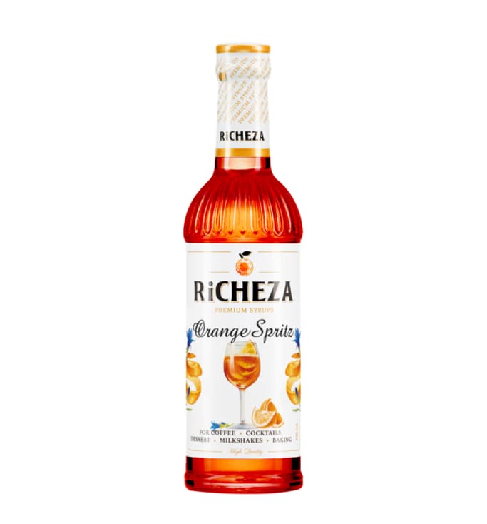 Апельсиновый спритц является основой для популярного в Европе коктейля спритц. Коктейль спритц состоит из комбинаций белых вин типа Просекко, апероля и минеральной воды, подаваемых в бокале с большим количеством льда, украшенном долькой апельсинa или грейпфрута. Сироп RiCHEZA Апельсиновый Спритц – это безалкогольная вариация знаменитого коктейля. Он обладает ярким цитрусовым вкусом и легкой горечью трав в послевкусии.
